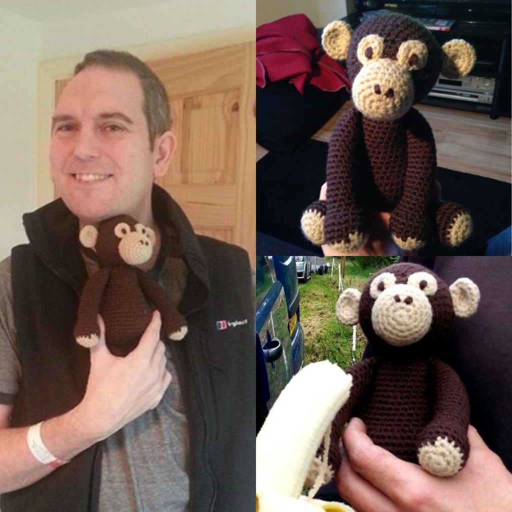 Sam was known as the northern monkey so it seemed appropriate to make him a crochet monkey. Unfortunately before I could finish the commission Sam suffered a very serious head injury, he lost part of his brain and was in a coma for two weeks. I dropped every other project I had on because I was determined that Sam would have his monkey when he woke up.